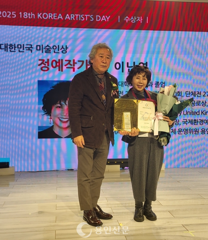 용인신문 | 한국미술협회 주최로 지난 5일 대한민국예술인센터 로운쇼룸에서 열린 제18회 대한민국 미술인날 시상식에서 서양화가 이난영 전 용인여성작가회 회장이 대한민국정예작가상을 수상했다.