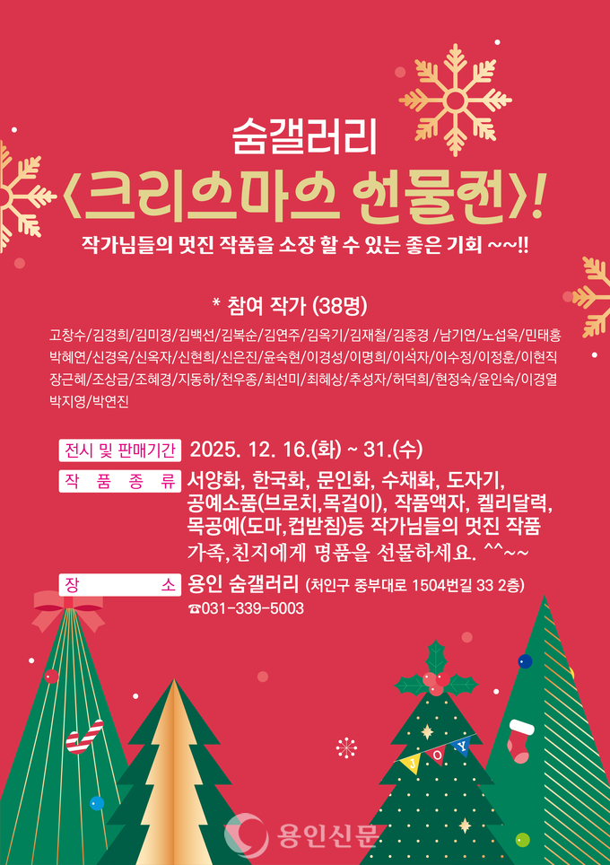 용인신문 | 숨갤러리가 크리스마스를 맞아 ‘크리스마스 선물전’을 16일부터 31일까지 개최한다. 이번 선물전은 크리스마스를 맞아 가족과 친지에게 연말 선물용으로 작가들의 작품을 선물하고, 소장도 할 수 있는 좋은 기회다.