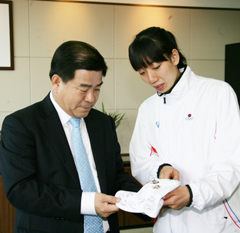 서정석 용인시장이 지난달 28일 2008 베이징 올림픽 여자핸드볼 국가대표로 참여해 동메달을 수상하는 활약을 펼친 이민희 선수에게 포상금을 전달하고 격려했다. 이민희 선수는 용인시청 핸드볼팀 소속돼 지난해부터 용인시청에 소속해 2007년 핸드볼큰잔치 우승, 2008년 핸드볼큰잔치 준우승 등 우수한 성적을 내는데 이어 이번 하계올림픽에서 동메달을 수상하는데 맹활약을 펼쳤다.