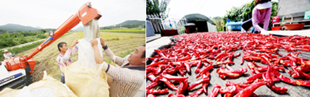 결실의 계절을 맞아 황금빛으로 물든 농촌 들녘마다 가을걷이가 한창이다. 추석을 앞두고 여름내 흘린 땀의 결실을 거둬들이는 농민들의 얼굴이 수확의 기쁨으로 가득하다. 사진은 처인구 백암면의 추수(좌) 풍경과 원삼면의 한 농민이 고추를 말리는 모습(우).
