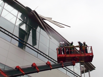 지난 13일 오후 1시경 갑작스런 강풍에 마감이 덜 된 지붕이 파손돼 역사 지붕에 아슬아슬하게 매달려 도로에 떨어질 뻔 한 상황이 벌어졌다.
