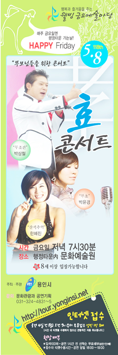 용인시는 웰빙금요예술마당 118번째 공연으로 트롯트가수 한혜진, 박상철, 박윤경의 ‘효’ 콘서트를 갖는다.