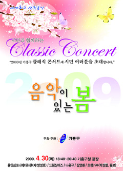 오는 30일 오후 6시 40분 기흥구청 광장에서 열리는 ‘음악이 있는 봄’ 공연은 기흥구에서 지난해에 이어 두 번째로 마련한 교향악 무대로 용인심포니에타와 합창단 드림싱어즈, 베이스 나윤규, 테너 김영환 등이 출연한다.
