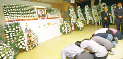 고 김대중 전 대통령 서거 닷새째인 22일 분향소가 마련된 처인구청에 조문객 행렬이 끊이지 않는다. 밤 늦은 시간이지만 조문을 위해 달려온 시민들이 엄숙한 가운데 영정 앞에 헌화하고 절을 올려 고인의 영면을 기원하고 있다.