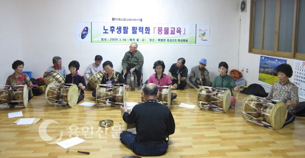 풍물교육은 총20회에 걸쳐 원삼면 두창1리 황토현건강장수마을 마을회관에서 진행됐다. 백암 흰바위 농악을 전수받은 배소희 강사가 20여명 어르신을 대상으로 ‘경기 웃다라풍물지신밟기 12마당’을 지도했다.