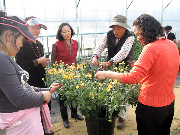 교육생들은 그동안 국화 모종 옮겨심기, 순지르기, 가지 유인하기, 형상작 틀만들기 등 여름 내내 땀 흘려 일했으며 전시회를 위해 꽃송이 하나하나에 꽃받침을 고정하는 작업까지 마무리했다.