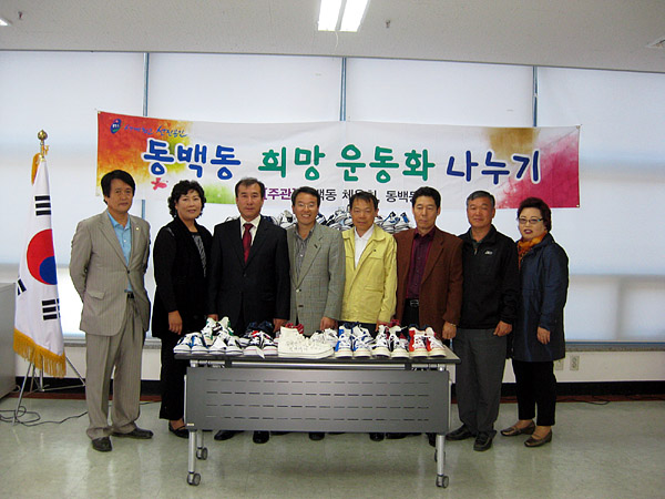 이날 전달한 운동화는 지난 5월 31일 동백동체육회가 주최한 제3회 한마음 걷기대회를 통해 모인 것으로 동체육회, 통장협의회, 남녀 새마을지도자회, 청소년지도위원 등이 운동화를 기증한 것과 걷기대회에 참가한 주민들이 모은 동전으로 마련한 것이다.