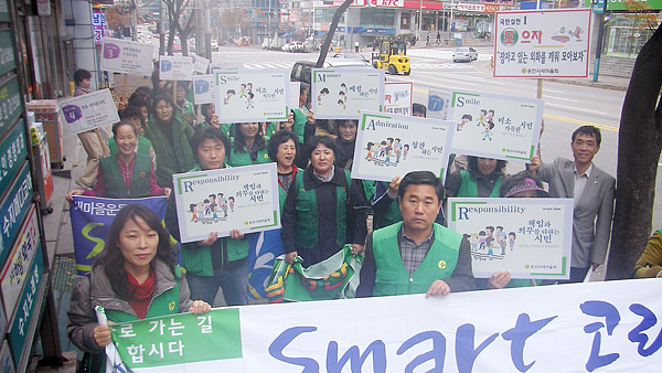 나라의 품격을 높이기 위해 친절, 배려, 칭찬, 법질서, 글로벌에티켓 등을 생활 속 실천운동으로 확산하는 스마트코리아운동의 홍보물을 배포하며 가두 행진을 펼쳤다.