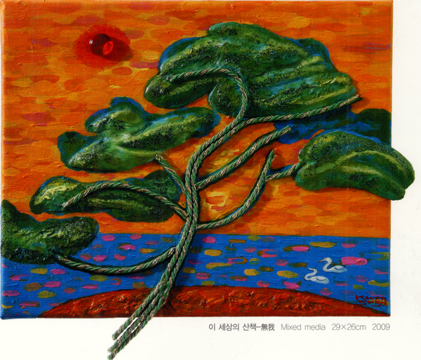 이전부터 선보여온 ‘떨기나무-처음사랑’ 연작들을 통해 초등학교 교정이라는 공간에서 교문은 탄생을 운동장은 치열하게 살아가는 과정을 학교 건물위에 나부끼는 깃발은 죽음이후의 영원한 세상을 상징한 표현을 해왔다.