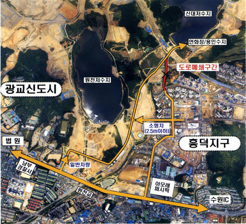 이에 따라 흥덕지구 북측에서 수원 연화장 방향으로 연결되는 기존 도로는 19일부터 광교지구 내 본도로 개설 완료시까지 임시폐쇄 조치된다. 또, 흥덕지구 내에서 기존도로를 이용하는 차량은 서쪽 원천리천 횡단교량을 통해 임시 도로로 진입해야 한다.