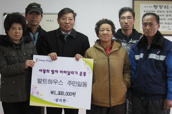 78세대로 구성된 발트하우스에서는 동절기를 맞아 평창 4리와 인접한 평창1리의 소외 이웃을 돕자는 취지로 12월 중 성금을 모았고 이런 뜻을 양지면에 전해 20일 평창1리 대동회가 열리는 날 평창1리 마을회관에서 양지면장을 통해 전달했다.