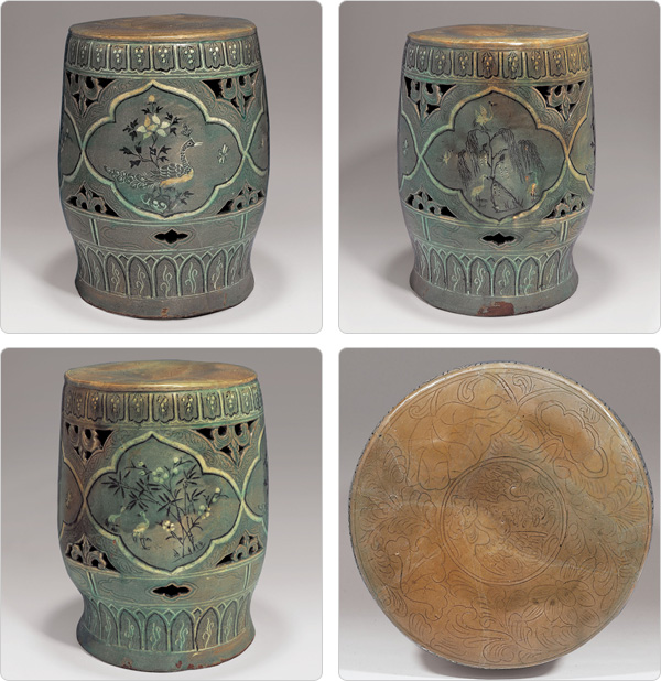 작품은 높이 41.6cm, 지름 30.8cm로 배가 약간 튀어나온 원통형이며 의자의 윗면에는 봉황과 연꽃무늬가 음각되어 있다. 또한 몸체 4면에는 상감기법으로 각각 공작 · 모란, 매화 · 대나무 · 학, 버드나무 · 학의 모습이 새겨져 있다.