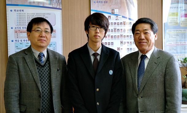 | ▲ 좌로부터 성지고 하용화 교장, 신건 학생, 신갈농협 김종기 조합장 | ||