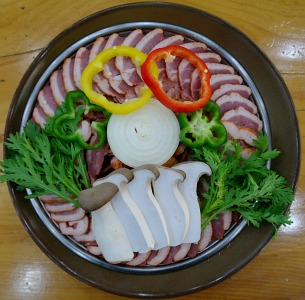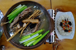 ‘도둑골’의 또 하나 별미인 유황오리백숙은 풍부한 맛을 내기 위해 2시간이상 끓여주는 음식으로 예약한 손님만이 진국을 맛볼 수 있다. 같이 나온 찹쌀밥으로 직접 죽을 만들어 먹는 재미도 쏠쏠하다.