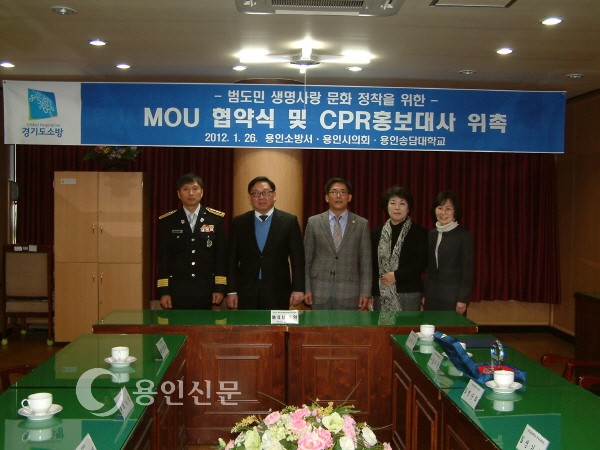 용인소방서(서장 전광택)와 용인송담대학교(총장 최성식)는 지난 26일 범국민 심폐소생술(CPR) 보급ㆍ확산을 위한 MOU를 체결하고 김기준 용인시의회 복지산업위원장과 이혜자 용인송담대학교 간호학과장을 홍보대사로 위촉했다.