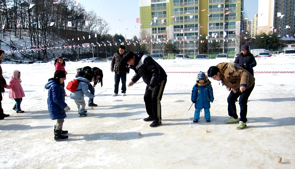 폐장을 하루 앞둔 지난 4일 초등부와 성인부로 나뉘어 열린 팽이치기 대회에서는 상갈동 주민들이 폐장을 아쉬워 하면서 얼음을 즐겼다.