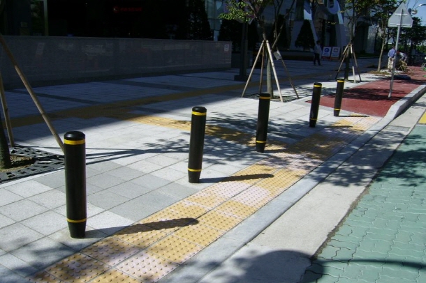 교통약자의 이동편의 증진법 시행규칙에는 높이 80~100cm, 직경 10~20cm의 볼라드를 1.5m 간격으로 설치하고 보행자 등의 충격을 흡수할 수 있는 재료를 사용하며 전면 0.3m에 시각장애인을 위한 점형 블록을 설치하도록 돼있다.