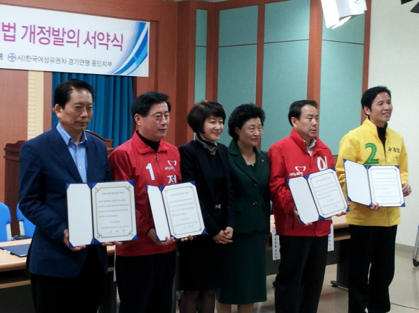 한국 여성유권자경기연맹 용인지부는 지난달 29일 시청 브리핑룸에서 이우현, 우제창, 정찬민, 우태주 후보 등이 참석한 가운데, ‘지방자치법 개정’ 서약식을 개최했다.