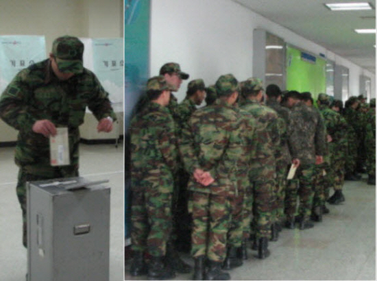| 지난 6일 처인구 실내체육관. 부재자 투표를 하기 위해 줄 서있는 군장병들 | ||