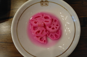 연근 볶은 차를 물 대신 내오며 식전에 나오는 전채음식인 죽과 전도 변화를 준다.