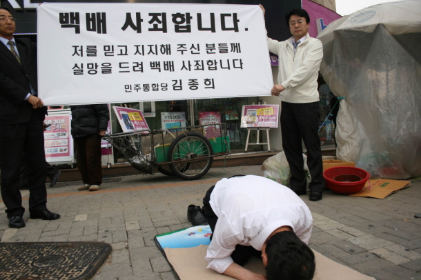 4·11 총선 ‘용인병’ 선거구에서 석패한 민주통합당 김종희 후보가 지지해 준 시민들에게 100배 절을 하며 낙선 인사를 펼쳤다.