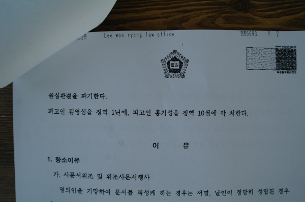 법원은 판결문에서 업무상횡령, 사문서위조, 위조사문서행사 혐의에 대해 횡령액(8279만여원)이 크고 범행을 부인하는 등 잘못에 대한 반성의 기미를 보이지 않은 점이 양형조건이라고 밝혔다. 지난 2011년 2월 11일 1차 판결에서 법원은 증거불충분으로 K씨에게 무죄를 선고한 바 있다.