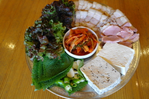 오리훈제 보쌈은 부추와 양파, 버섯에 오리훈제를 얹어 손님 건강을 생각해 준비된 요리로 일반 보쌈을 생각하고 먹다보면 토담두부만의 독특하고 새로운 맛에 매료된다.