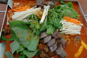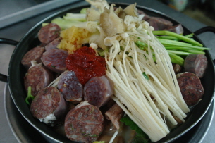 전통순대와 찰순대, 곱창, 버섯, 당면, 떡을 넣고 신선한 야채를 덮어서 화끈한 철판에 익히는 순대곱창철판볶음은 매콤, 달콤한 맛으로 주로 아이들과 여성고객을 사로잡았다.