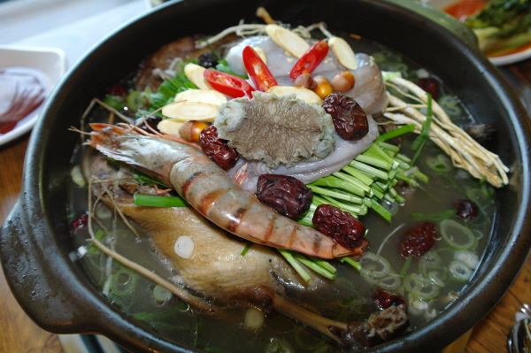 다른 메뉴인 한방유황오리백숙은 특별히 대하, 낙지, 홍합 등 해산물로 시원한 맛을 추가했다. 앞으로 능이버섯을 추가로 첨가할 계획이다.