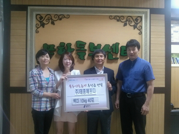 처인구 모현면에 위치한 주)태종에프디 임직원이 지난 19일 시 무한돌봄센터를 방문, 긴급 위기가정을 위한 백미 10kg 40포를 전달했다.