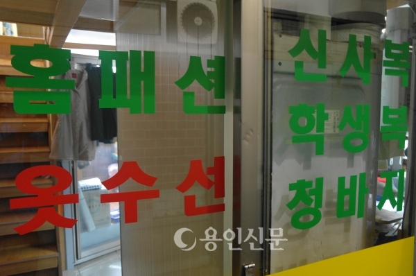 출입문 유리에는 옷 수선, 홈패션, 신사복, 학생복, 청바지라 적혀 있고 창문 유리에는 밍크, 가죽, 숙녀복, 무스탕, 핸드매드라는 문구가 있어 수선할 수 있는 모든 옷 종류를 나타내고 있다.