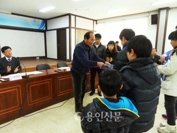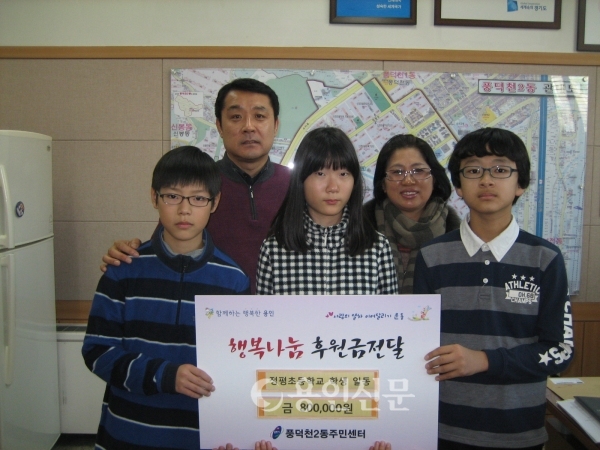 8. 정평초등학교 남기운 교사와 전교어린이회 임원들이 지난 11일 풍덕천2동주민센터에 전교생을 대상으로 모금한 이웃돕기 성금 80만원을 전달했다.