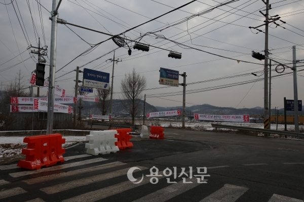 | ▲ 안성시 주민들이 지난해 12월 28일 개장한 용인시 시립장례문화센터 ‘용인 평온의 숲’ 입구에 걸어 놓은 피해보상 요구 현수막 모습. 10년 전 안성시 양성면에서 안성시립 쓰레기 위생매립장 건설당시 연출됐던 모습들이 장소와 대상이 바뀐채 재현되고 있다. | ||