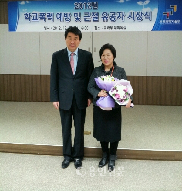 지난달 31일 교육과학기술부 대회의실에서 열린 “2012년 학교폭력 예방 및 근절 유공자 시상식”에서 용인송담대학교 유아교육과 조희순 교수가 수상했다.