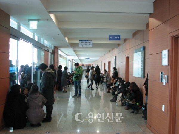 | ▲ 지난 2012년 보육시설 원장과 학부모들이 필요경비 현실화 등을 요구하며 시청 복도에서 시위를 이어가는 모습. 용인신문 자료사진 | ||