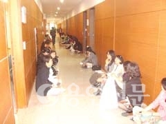 | ▲ 지난 2010년 보육비 동결에 반발하며 시장실을 항의방문해 시장실 앞에서 시위하는 모습. 용인신문 자료사진 | ||