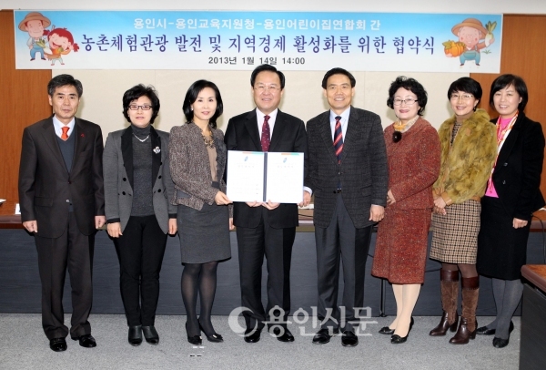 | ▲ 용인시는 지난 달 14일 오후 2시 시청 정책토론실에서 김학규 용인시장, 서현상 용인교육지원청 교육장, 목민숙 용인어린이집연합회장 등이 참석한 가운데 농촌체험관광 발전 및 지역경제 활성화를 위한 협약식을 체결했다. 이에 따라 용인시-용인교육지원청-용인어린이집연합회 3개 기관은 앞으로 용인의 미래를 이끌어 갈 후손들을 ‘행복한 용인’을 가꾸는 진정한 ‘용인사랑 관광홍보대사’로 육성하고 농촌체험학습을 통한 용인관광 발전과 지역경제 활성화에 기여할 계획이다. <관련기사 본지 948호 5면> | ||