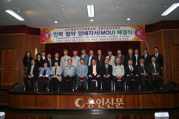 지난 25일 반월염색조합 대강당에서는 용인송담대학교(총장 최성식)와 반월염색조합 및 안산 5개 고등학교 간 염색 기술인 양성을 위한 양해각서 체결식이 있었다.