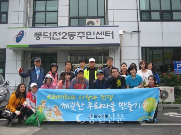 행사는 ‘쓰레기와의 사랑과 전쟁’의 일환으로 시의원, 통장, 주민자치위원, 부녀회원, 체육회원, 청소년지도위원, 노인회원, 자율방범대원 등 각 단체 회원 및 직원이 풍덕천2동주민센터 인근을 중심으로 하천 산책로와 주택가, 이면도로 등을 청소했다.