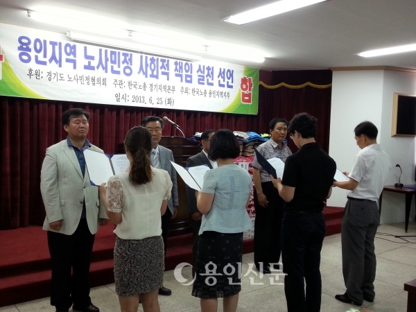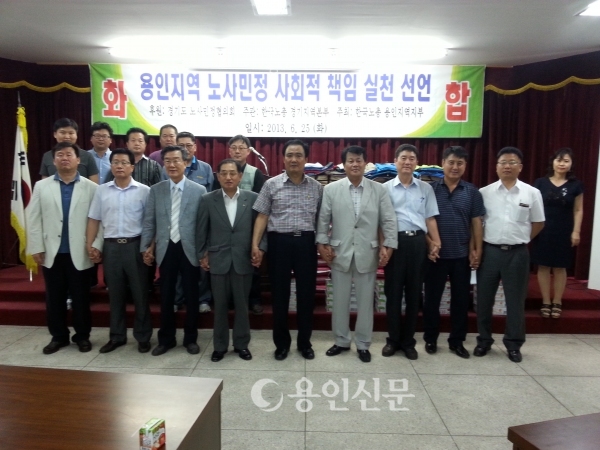 노측은 한국노총 용인지부 김완규 의장이, 주)럭키기술단 공학배 대표가 사측으로, 민은 용인시사회복지 협의회 홍성로 수석부회장이, 정은 시청 기업지원과 정기용 팀장이 각각 대표로 참석했다.