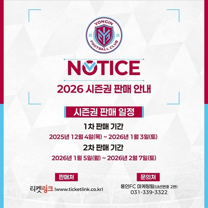 용인신문 | 내년 2월부터 열리는 ‘2026시즌 K리그2’ 출전을 목표로 창단 작업을 진행 중인 (재)용인시시민프로축구단(이하 용인FC)이 내년 초부터 시즌권 판매를 시작한다.